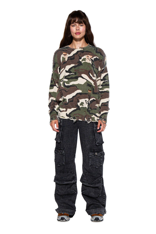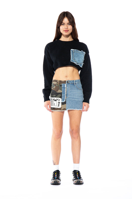 CAMO PATTERN JACQUARD SWEATER CARGO ZIP UP AND MINI SKIRT SET