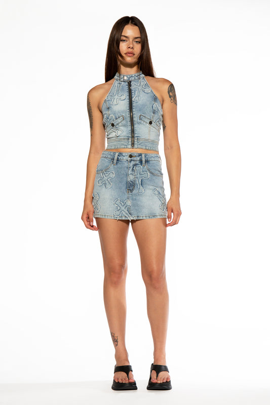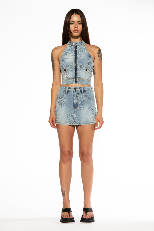 Cross Patch Halter Neck Denim Top