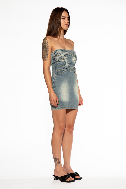DENIM MINI DRESS WITH CROSS PATCH AND STRAP