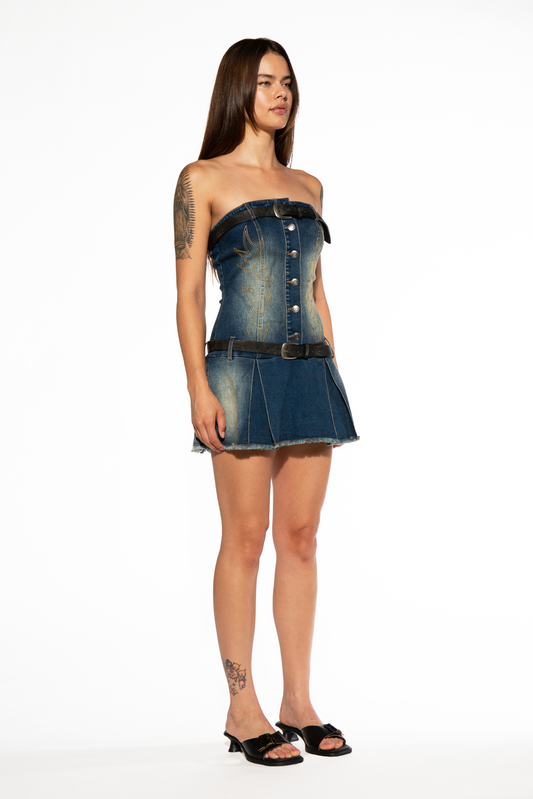 WESTERN EMBROIDERED DENIM PLEATED MINI DRESS
