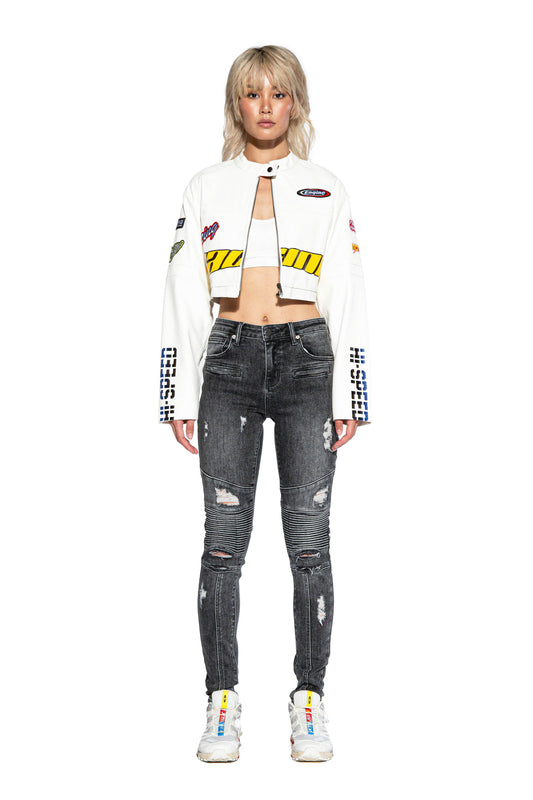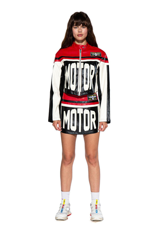 MOTOR LETTER FAUX LEATHER MINI JACKET