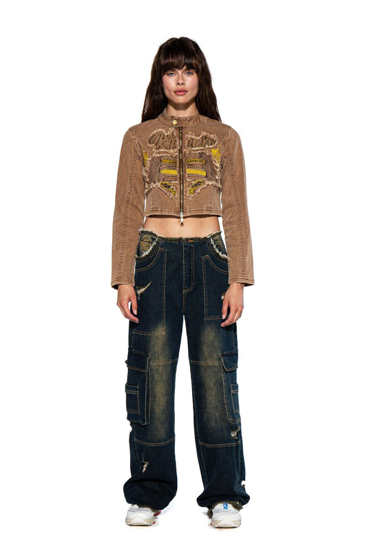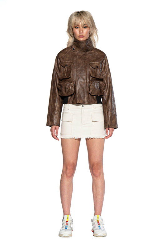 VINTAGE WASHED FAUX LEATHER CARGO MOTO JACKET
