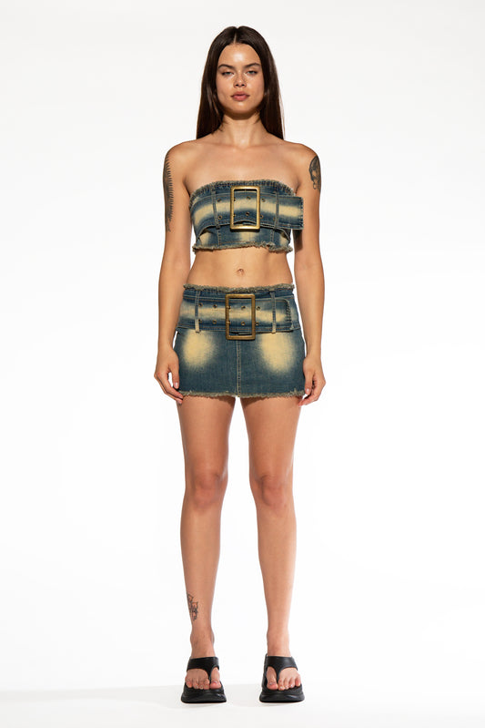 Oversized Belt Denim Tube Top & Mini Skirt Set