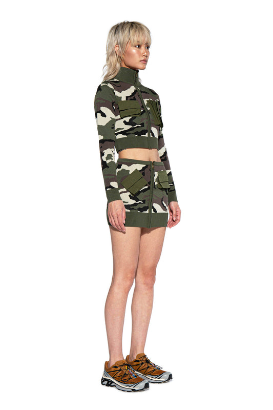 CAMO PATTERN JACQUARD SWEATER CARGO ZIP UP AND MINI SKIRT SET