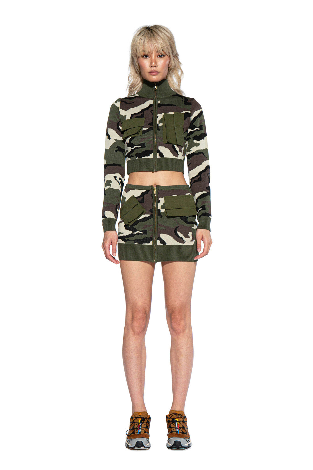 CAMO PATTERN JACQUARD SWEATER CARGO ZIP UP AND MINI SKIRT SET