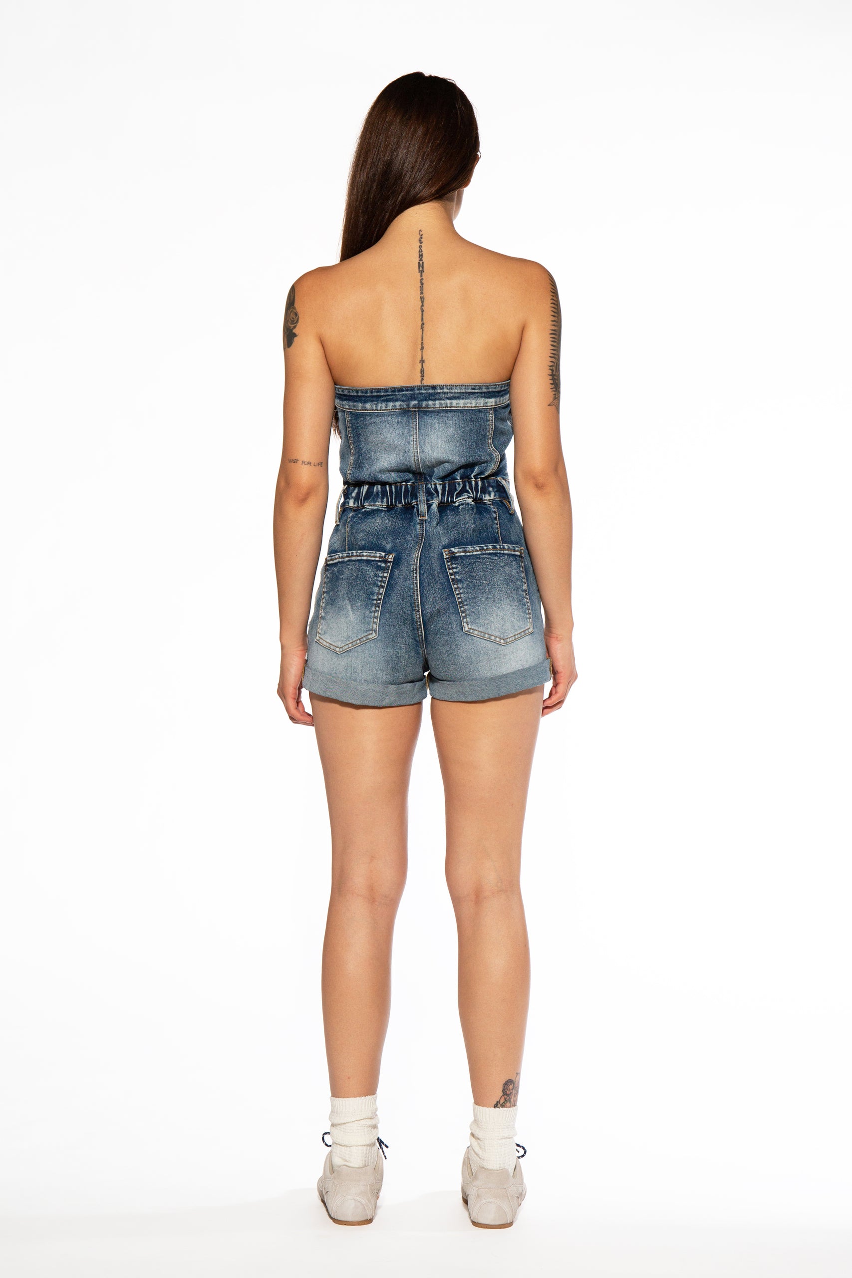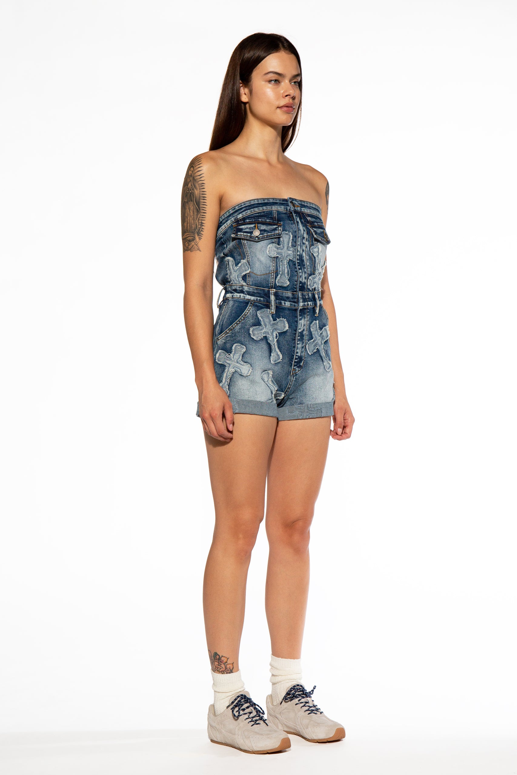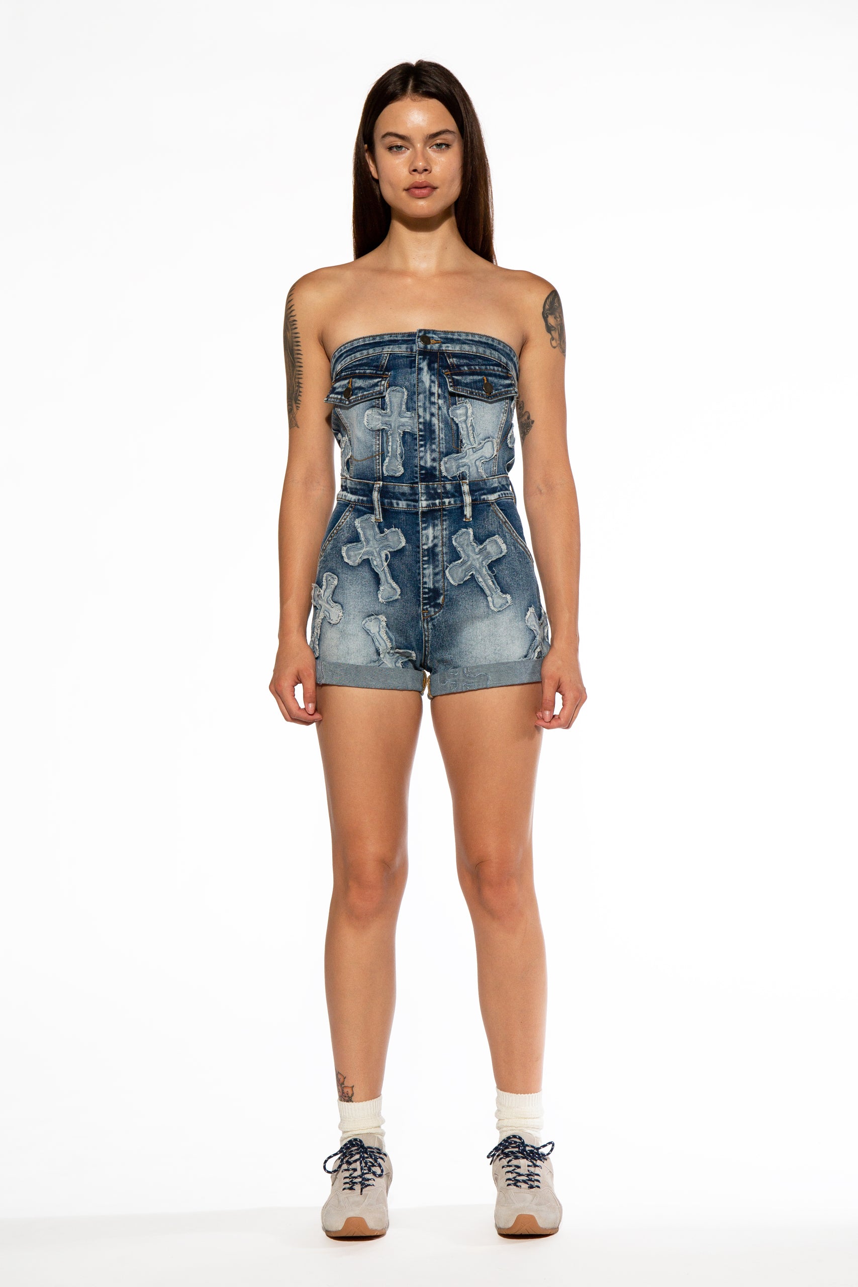 Cross Patch Tube Denim Romper