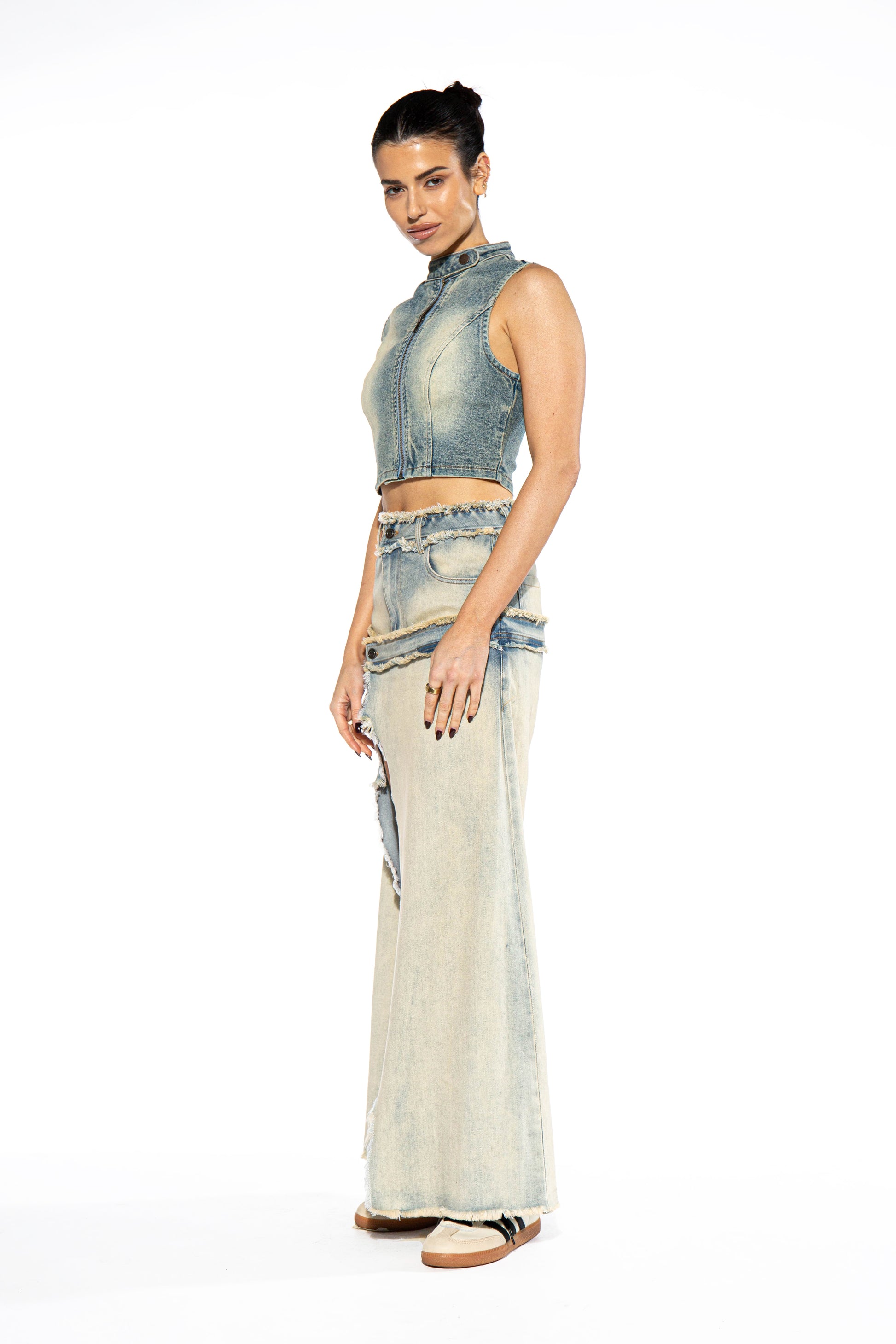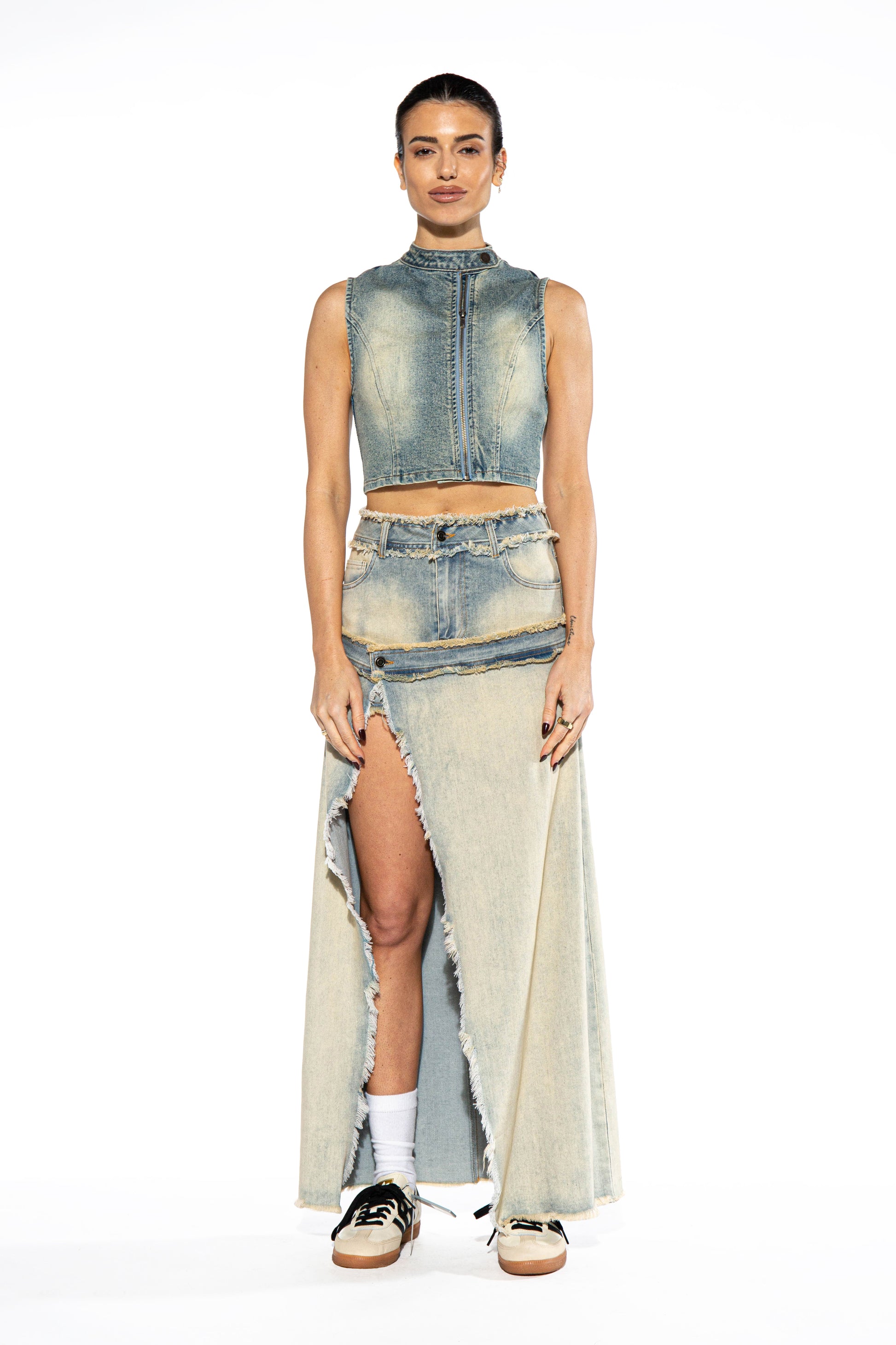 Double Layered Illusion Denim Maxi Skirt
