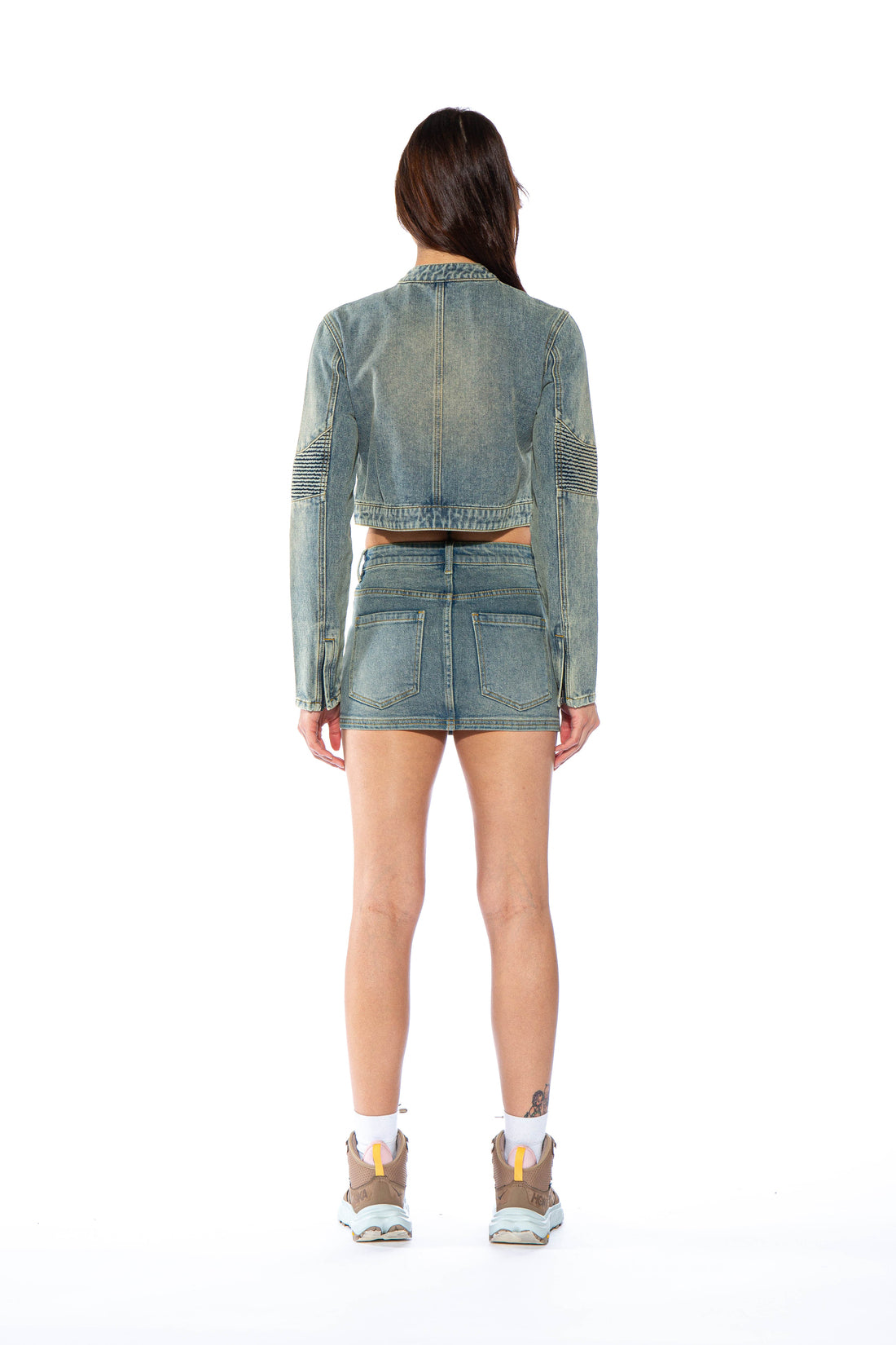 Ripple Vintage Washed Denim Moto Mini Skirt