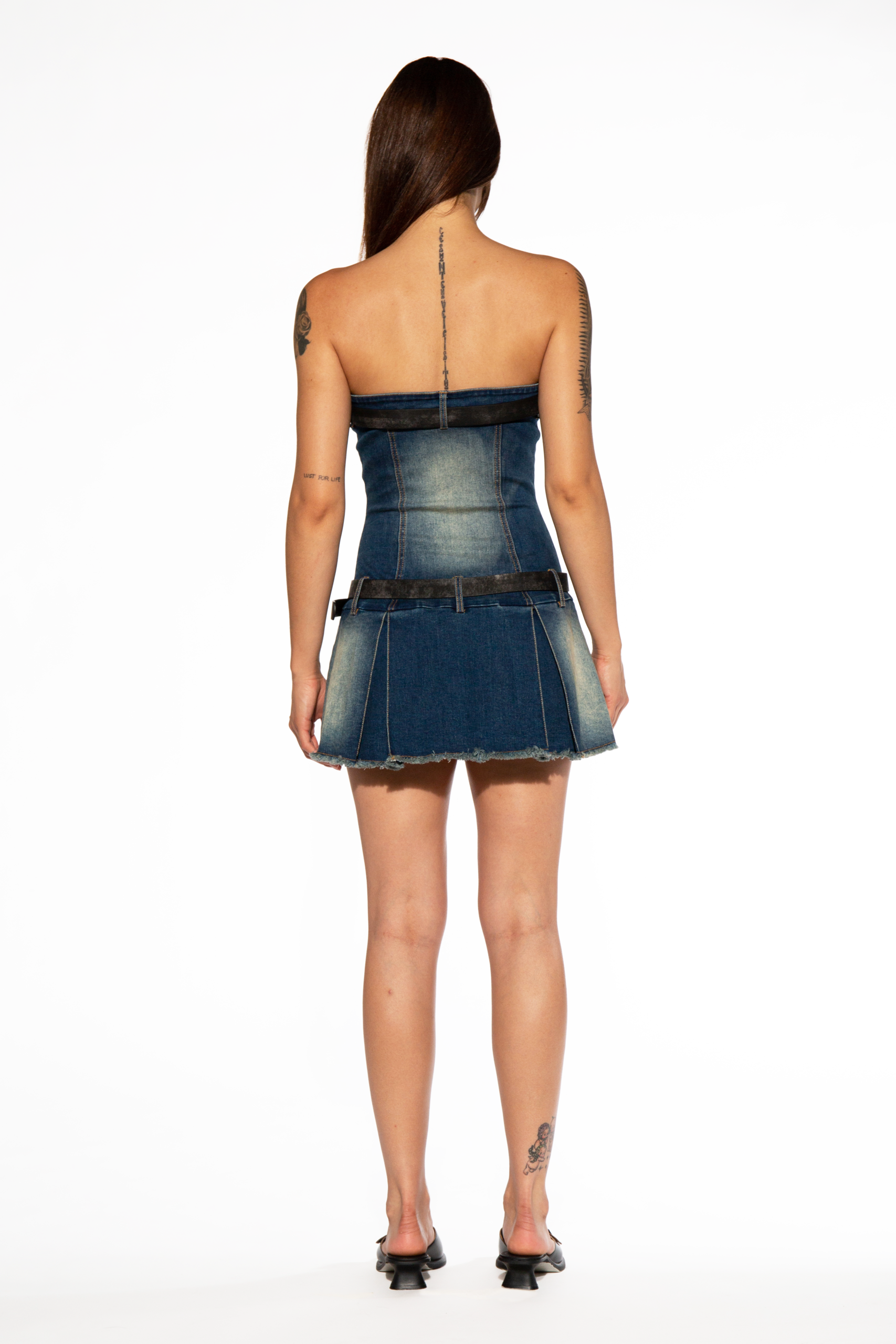 WESTERN EMBROIDERED DENIM PLEATED MINI DRESS