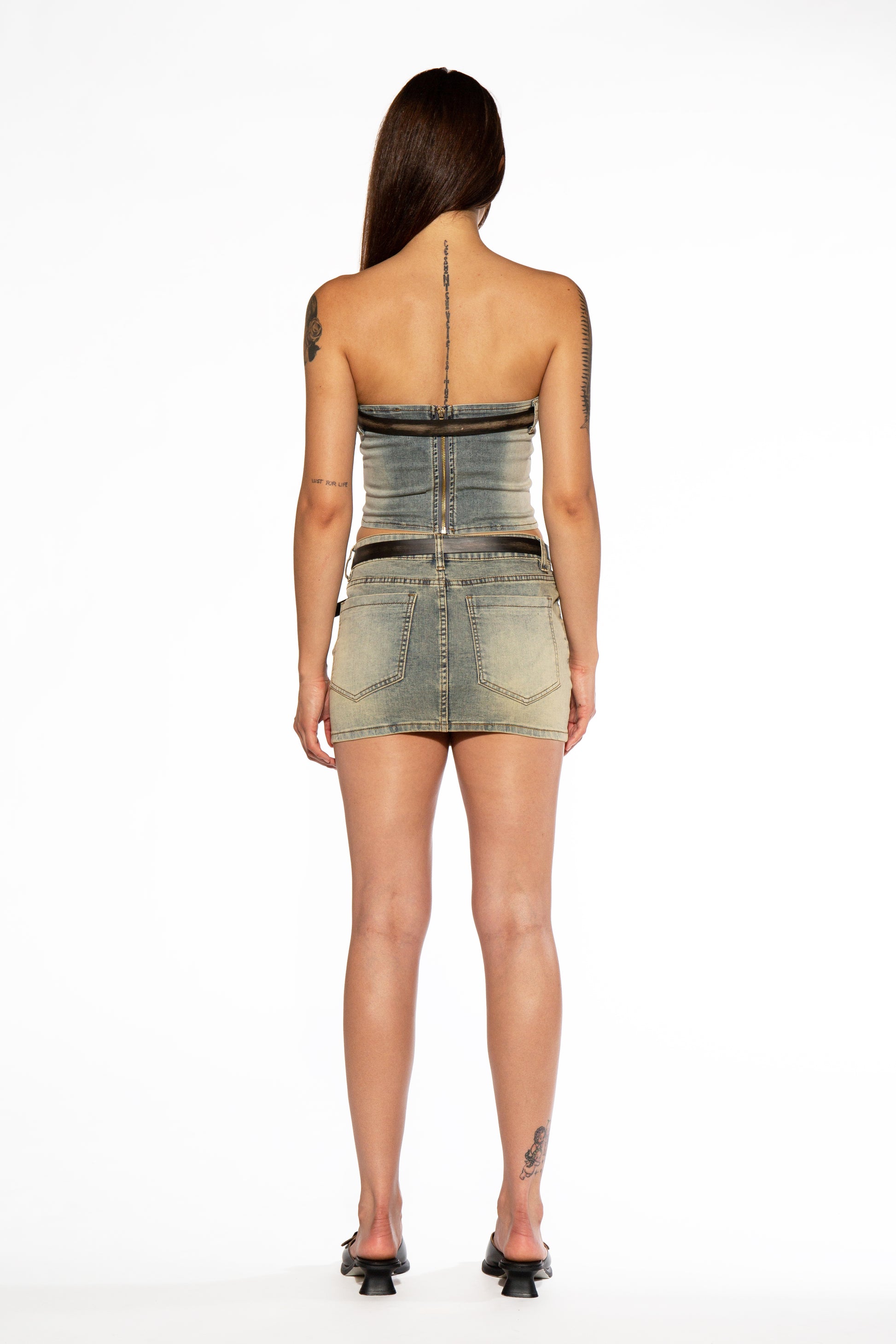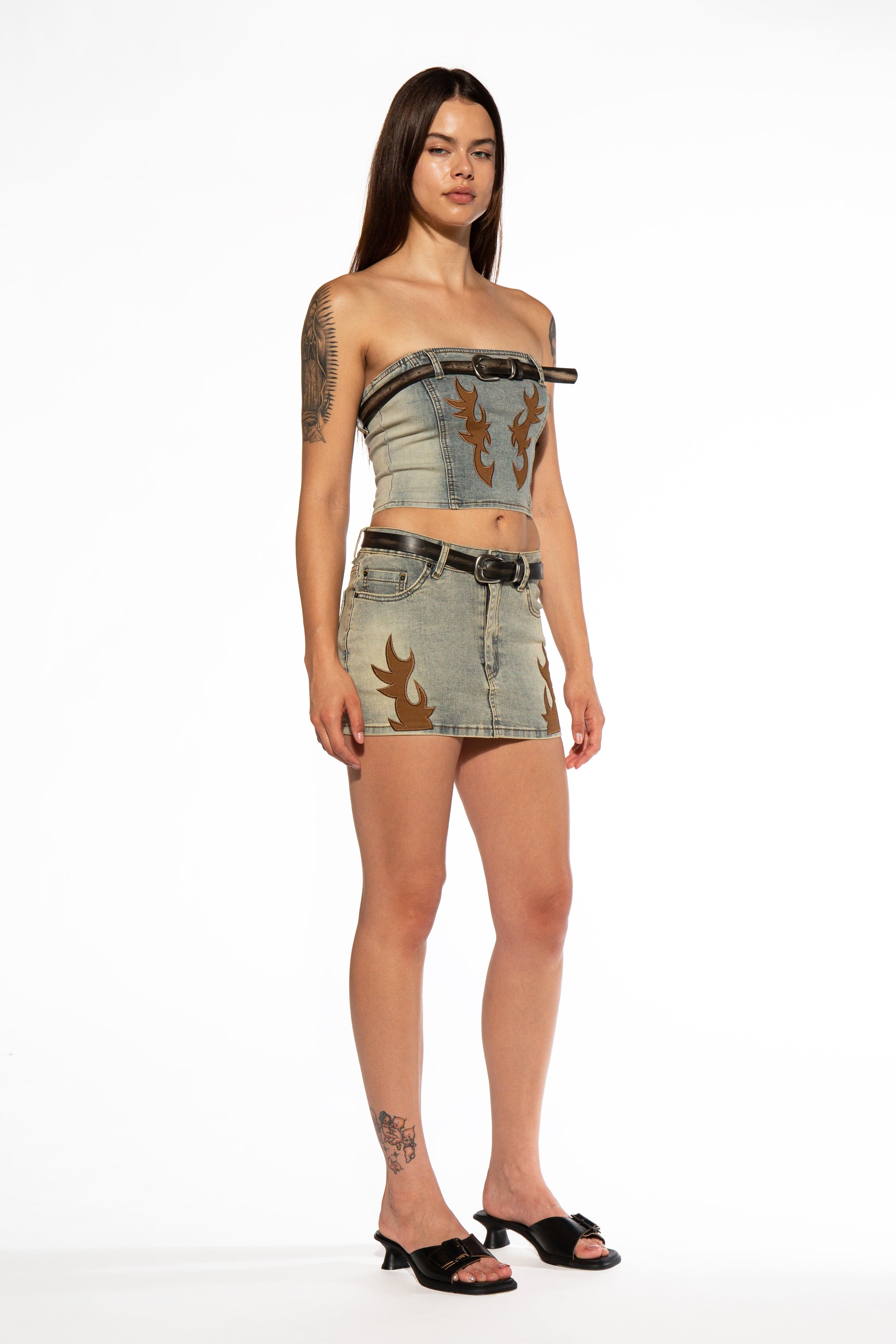 Western Patch Belted Denim Micro Mini Skirt